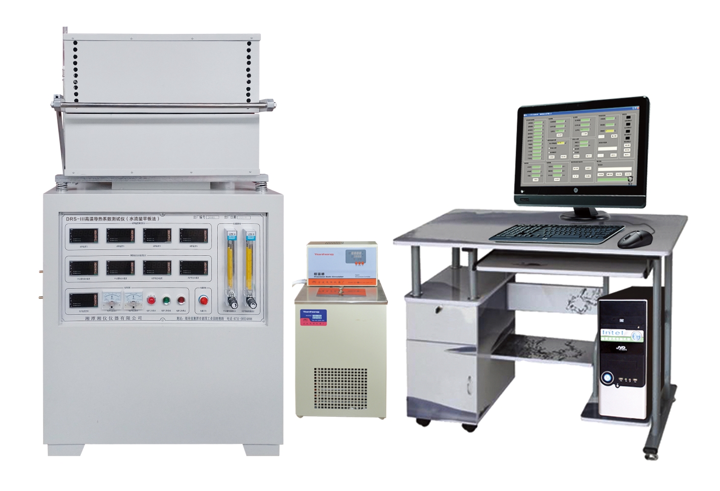 DRS-III导热系数测试仪适用于耐火保温、陶瓷纤维、毡、纺织物、板、砖等材料在不同温度下导热系数的测试。符合标准YB/T4130-2005耐火材料 导热系数试验方法(水流量平板法),GB/T17911-2018耐火纤维制品试验方法等。 按照YB/T4130测试标准,根据傅立叶一维平板稳定导热过程的基本原理,测定稳态时一维热流通过试样热面至冷面后被量热器中的水带走的热量。该热量Q与热导率λ成正比,与试样热面温差△T成反比,本仪器通过计算机系统自动完成测量与计算来测定Q、△T求得热导率λ。